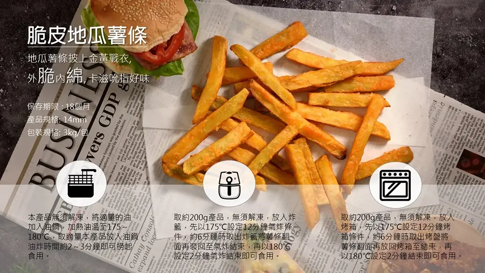 裹著酥脆戰衣的黃金地瓜薯條。適用在任何場合的萬人迷餐點!原料產地、自動化工廠一線加工製作好安心。